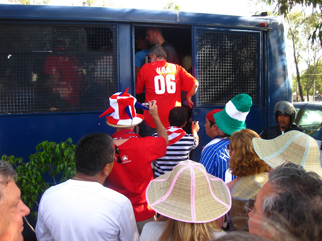 While we had taken the metro to the stadium, there was no way we could safely return in the same manner. Incredibly, our protection unit had another surprise waiting for us. We were led to a police provided riot-bus. I don't know about you, but I never imagined that I would find myself being escorted on a Mexican paddy-wagon! We packed aboard like sardines, and proceeded to drive through the streets of Mexico City, chanting and singing all the while. Eventually, we were let off at another metro station, away from the stadium and Mexican fans.